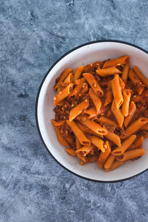 healthy plant-based food recipes concept, vegan penne pasta with red pesto and bean bolognaise sauce
