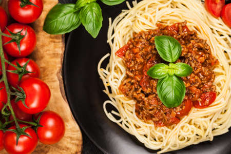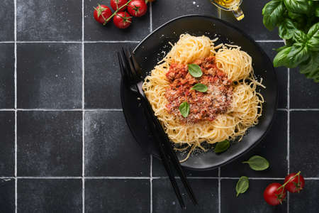 Pasta spaghetti bolognese with minced beef sauce, tomatoes, parmesan cheese and fresh basil in a plate on black tile background. Italian food, top view