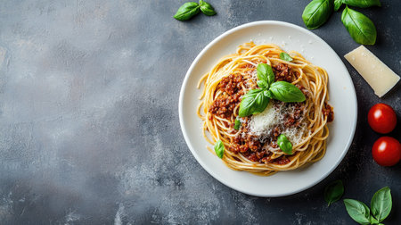 Spaghetti Bolognese on gray background. Traditional Italian pasta. Homemade food concept. Top view, flat lay, copy space