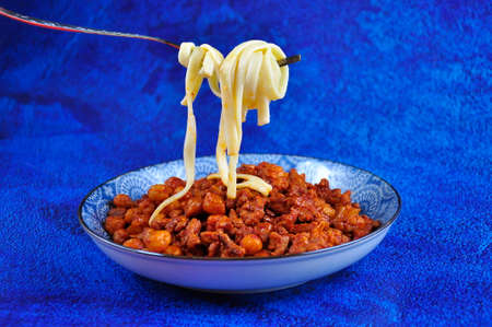 Tagliatelle all ragu - italian egg pasta with meat and tomatoes bolognese sauce. On white table and blue backdrop. Copy space.