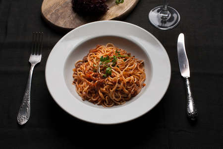 Traditional spaghetti bolognese. Food composition with hot pasta in a black plate with fork. Mediterranean, Italian food, simple dish. Flat lay, closeup
