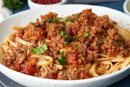 Pasta Bolognese Linguine with mincemeat and tomatoes, parmesan cheese. Side view, close up