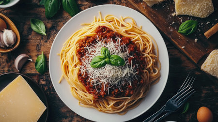 An elegant overhead shot features spaghetti topped with rich sauce, fresh basil, and grated cheese. A perfect representation of Italian cuisine.