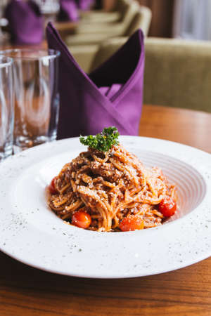 Spaghetti bolognese on a white plate in a restaurant