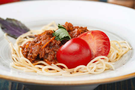Italian spaghetti pasta with beef and tomato sauce bolognese on white plate