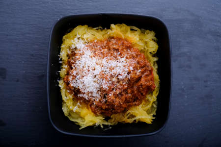 A high angle shot of spaghetti squash with tomato meat sauce