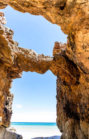 View from the cave a sandy beach along the ocean at golden sunset. Bali, Indonesia.