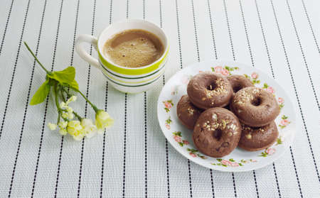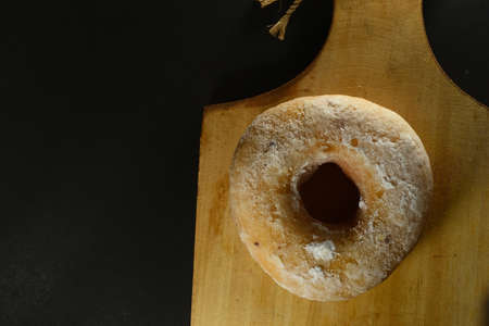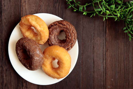 chocolate frosted doughnut on plate closeup isolated on wooden table