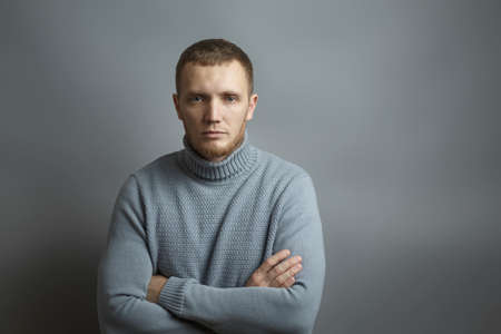 Man is seriously looking at the camera with his arms folded across his chest. On a gray background. Studio photo.