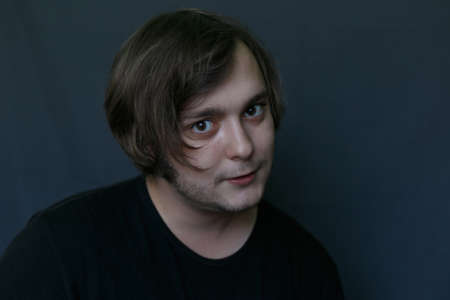 portrait of a young discontented man on a dark blue background who looks straight