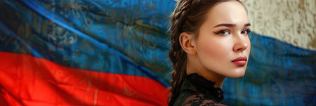 Portrait of a beautiful young woman on the background of the Russian flag