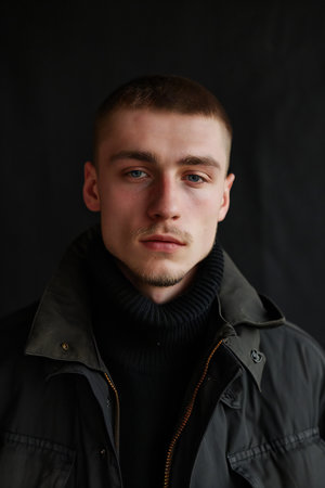 Portrait of a young man in a black jacket on a black background