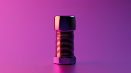 This image features a polished metal bolt standing against a vibrant gradient background of purple and pink. The bolt showcases intricate threading and a reflective surface, creating a striking visual for industrial or design themes.