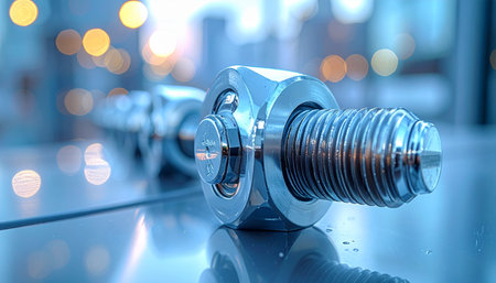 A detailed macro shot of a precision-machined metal bolt and nut, resting on a reflective surface in a modern factory.