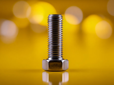 A polished metal fastener stands vertically on a glossy surface, its gleam accentuated by a soft yellow glow behind, symbolizing strength and precision in industry.