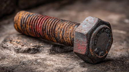 A close-up image of a rusty bolt showcasing detailed textures and wear on a rough surface, ideal for industrial and mechanical design concepts.