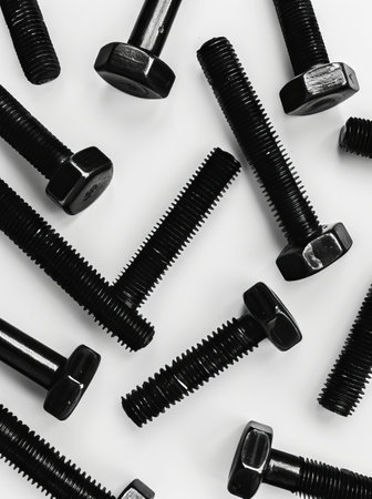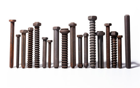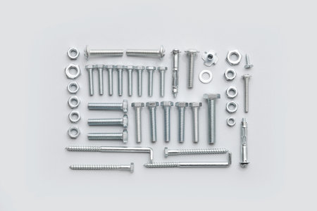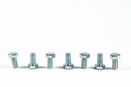 Metallic bolts arranged on a white background showcasing their industrial design