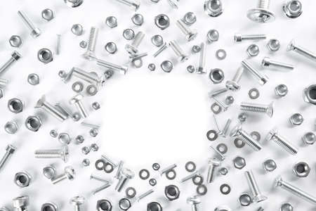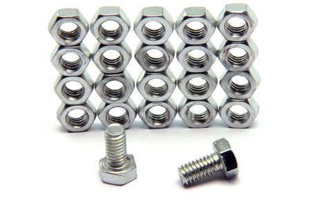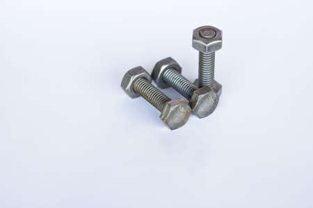 a iron screws and nuts on a white background for repair and construction