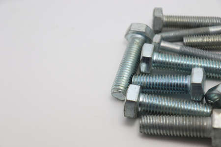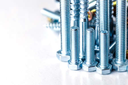 New metal bolts on a white background. Set of building tools for repair