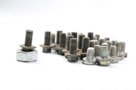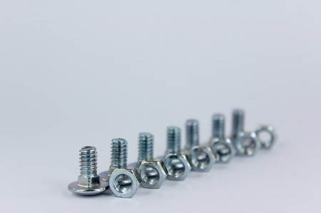 creative screw and nut arrangement with white background. Selective focus.