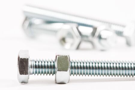 Steel bolts and nuts on white background close-up.