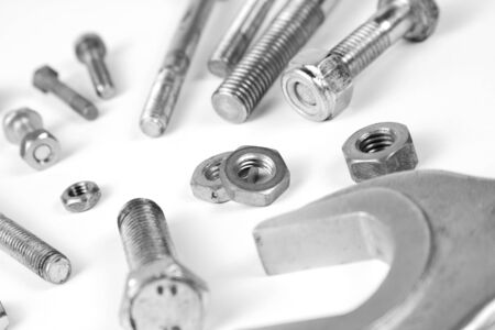 wrenches bolts and nuts on white background