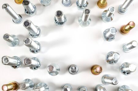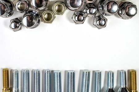 on a white background close-up new shiny nuts and bolts for car wheels with a place for inscription