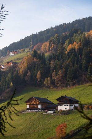 Typical scenery of Trentino Alto Adige South Tyrol in Italy in Dolomites Alps region during autumn with foliage and myst fog typical houses