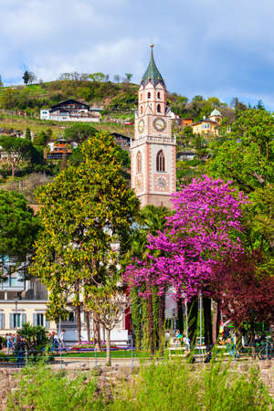 The spire of the church St. Nicholas and Merano panorama with mountains, South Tyrol, Italy