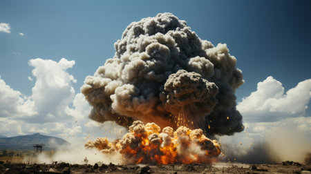 Nuclear blast on sunny day. Fire mushroom cloud. Atomic bomb explosion. Apocalypse, world war. AI Generated