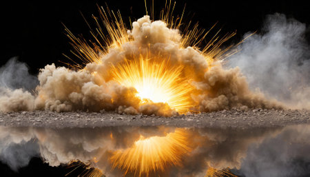 Shockwave expanding from powerful explosion, creating debris cloud and smoke. Ai generated