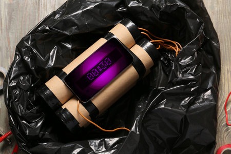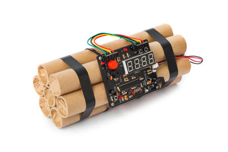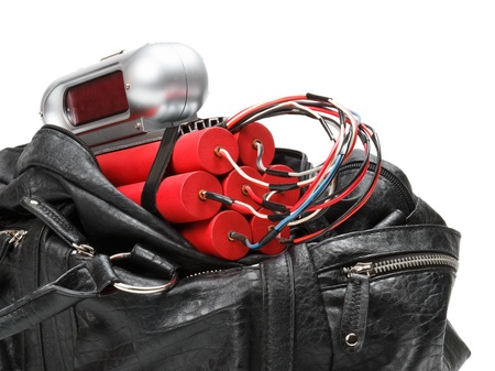 tnt time bomb with alarm clock detonator is in bag isolated on white