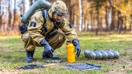 Bomb disposal expert wearing protective suit and getting ready to defuse explosives in a forest
