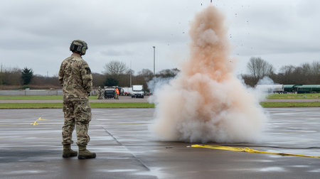 A soldier stands calmly observing a controlled explosion during military training exercises at an airfield under overcast skies, emphasizing safety and precision.