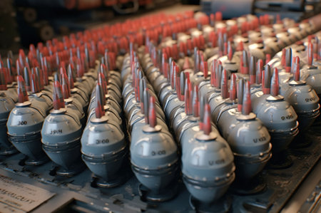Concentric arrangement of stacked warheads creates a powerful abstract, perfect for conceptual illustrations about defense, aggression, or arms development. Great detail and dramatic perspective.