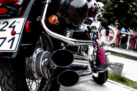 Close-up detail of a motorcycle, shot with selective focus. Chromed tailpipe, sparkling in the setting sun.