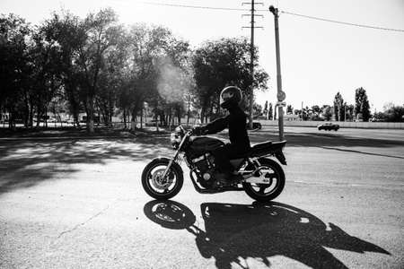 Man rides a motorcycle in the city.Young man in helmet and equipment rides a motorcycle on the road.Motorcyclist riding a bike during the day on the road.Black and white photo