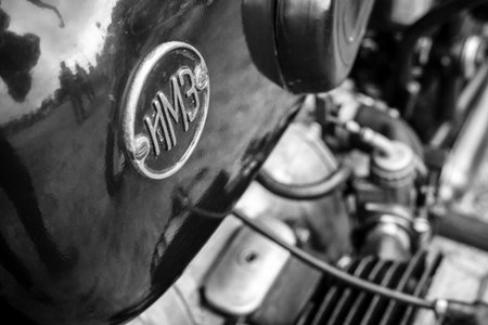 PAAREN IM GLIEN, GERMANY - JUNE 03, 2017: Emblem of a Soviet heavy motorcycle with a stroller IMZ-Ural. Black and white. Exhibition Die Oldtimer Show.