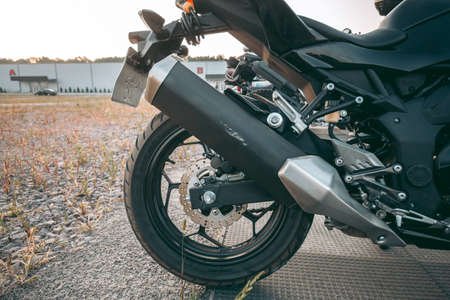 Close-up of exhaust or Intake of black sport racing Motorcycle with new tire and wheel in showroom. Low Angle Photograph Of Motorcycle.