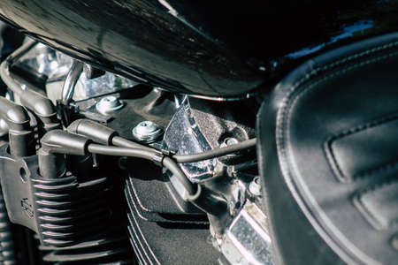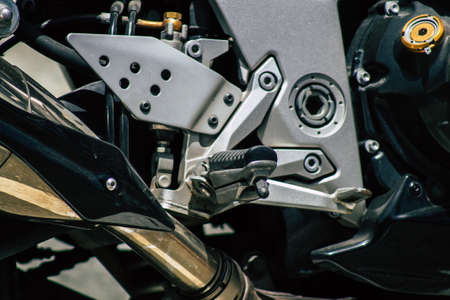 Seville Spain July 12, 2021 Closeup of the mechanics of a motorcycle parked in a parking lot located in the city center of Seville, an emblematic city and the capital of the region of Andalusia, in the south of Spain