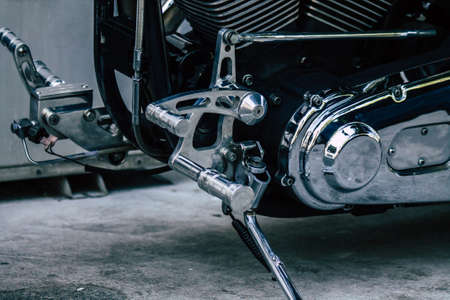 Motorbike with shining parts, close up. Motorcycle engine, toned