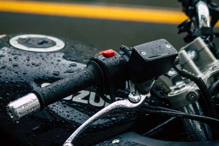 Budapest Hungary july 19, 2020 View of a motorcycle under the rain parked in the streets of Budapest the capital and the most populous city of Hungary