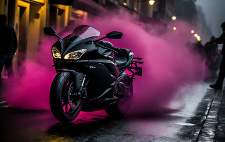 a motorcycle parked in the dark emits burning smoke, creating a post-apocalyptic ambiance. the polished concrete backdrop enhances the distressed surfaces, while supernatural creatures lurk in the shadows. this high-quality, 32k uhd photo captures the essence of valentin serov's artistic style. ai generated