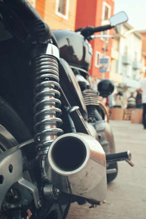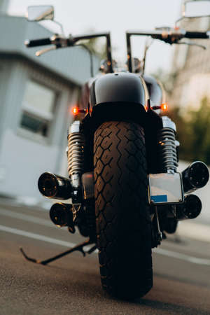 Motorcycle in the parking lot, rear view. Tire tread and chrome tailpipes. Stylish custom chopper motobike with chrome parts. Soft selective focus.
