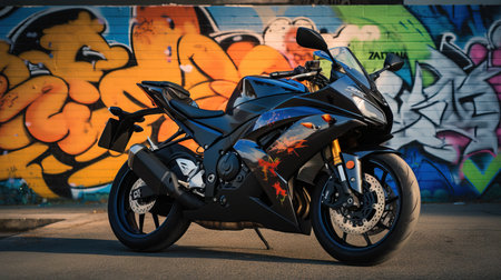 a black motorcycle parked in front of a graffiti covered wall with a graffiti covered wall behind it and a wall with a graffiti covered wall behind it. . generative ai