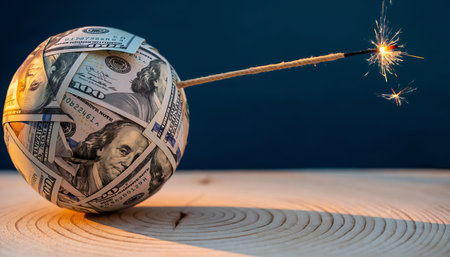 A ball covered in US dollar bills with a sparkler acting as a fuse, about to explode, representing financial risk and instability.