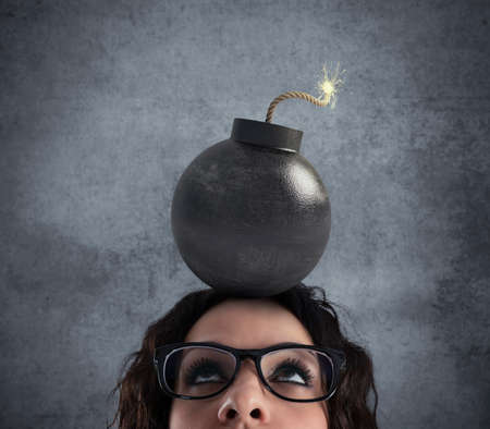 Businesswoman stunned by strong headache with a bomb over the head
