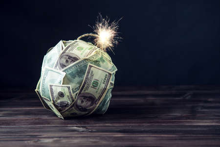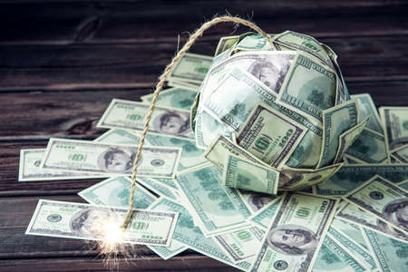 Big bomb of money hundred dollar bills with a burning wick. Little time before the explosion. The concept of financial crisis
