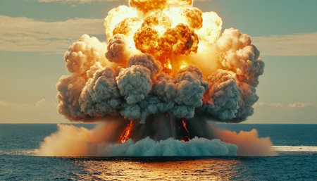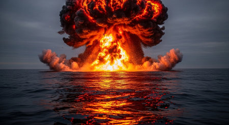 a dramatic nuclear explosion over the ocean, mushroom cloud reflecting on the water surface