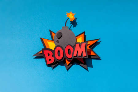 Handmade paper speech bubble on blue background. Cartoon and pop art style. Boom text. Expression. Bomb.